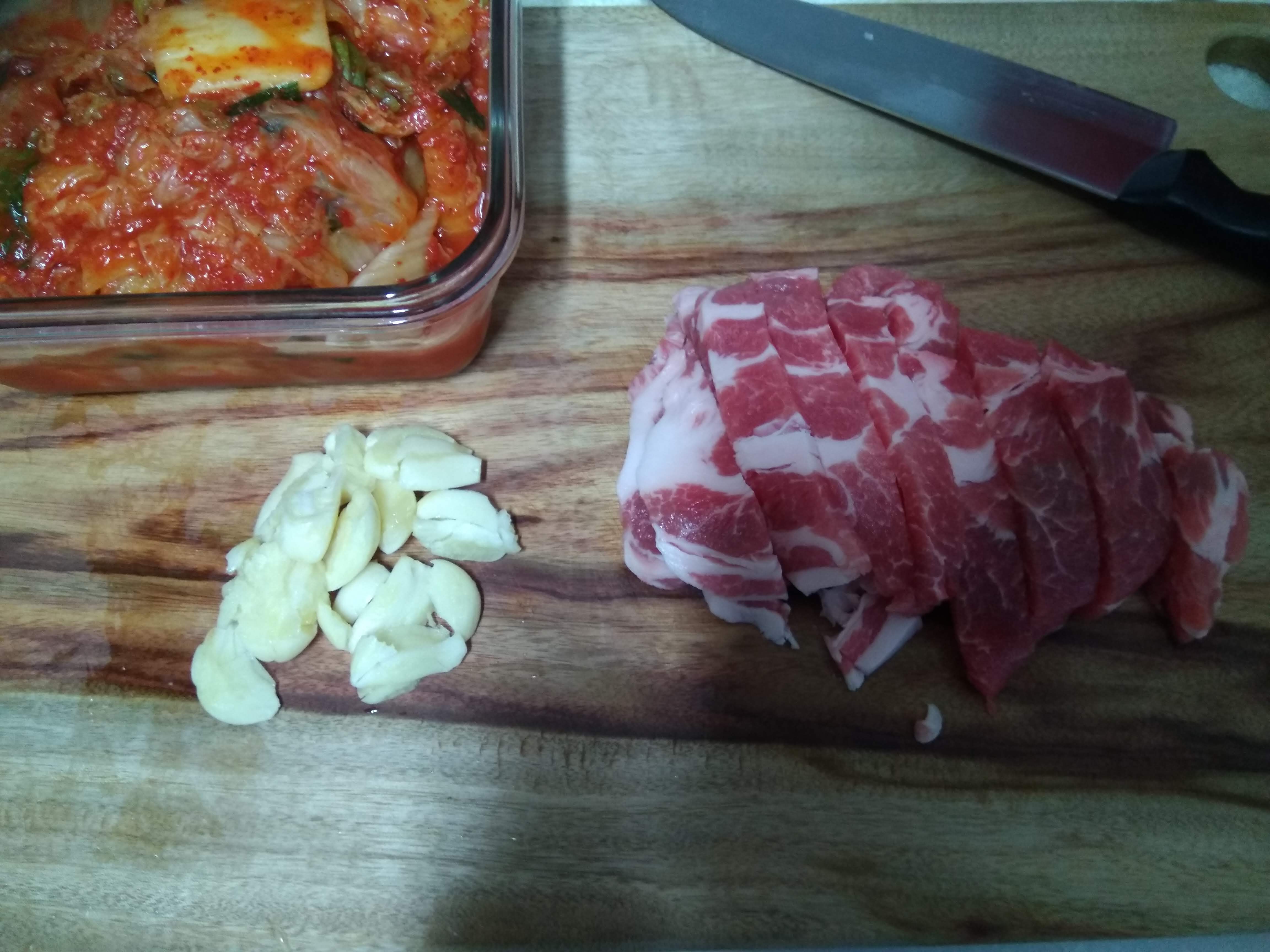 재료: 두부, 돼지고기 목살, 마늘, 김치, 대파, 양념(설탕, 고춧가루, 간장, 맛술)