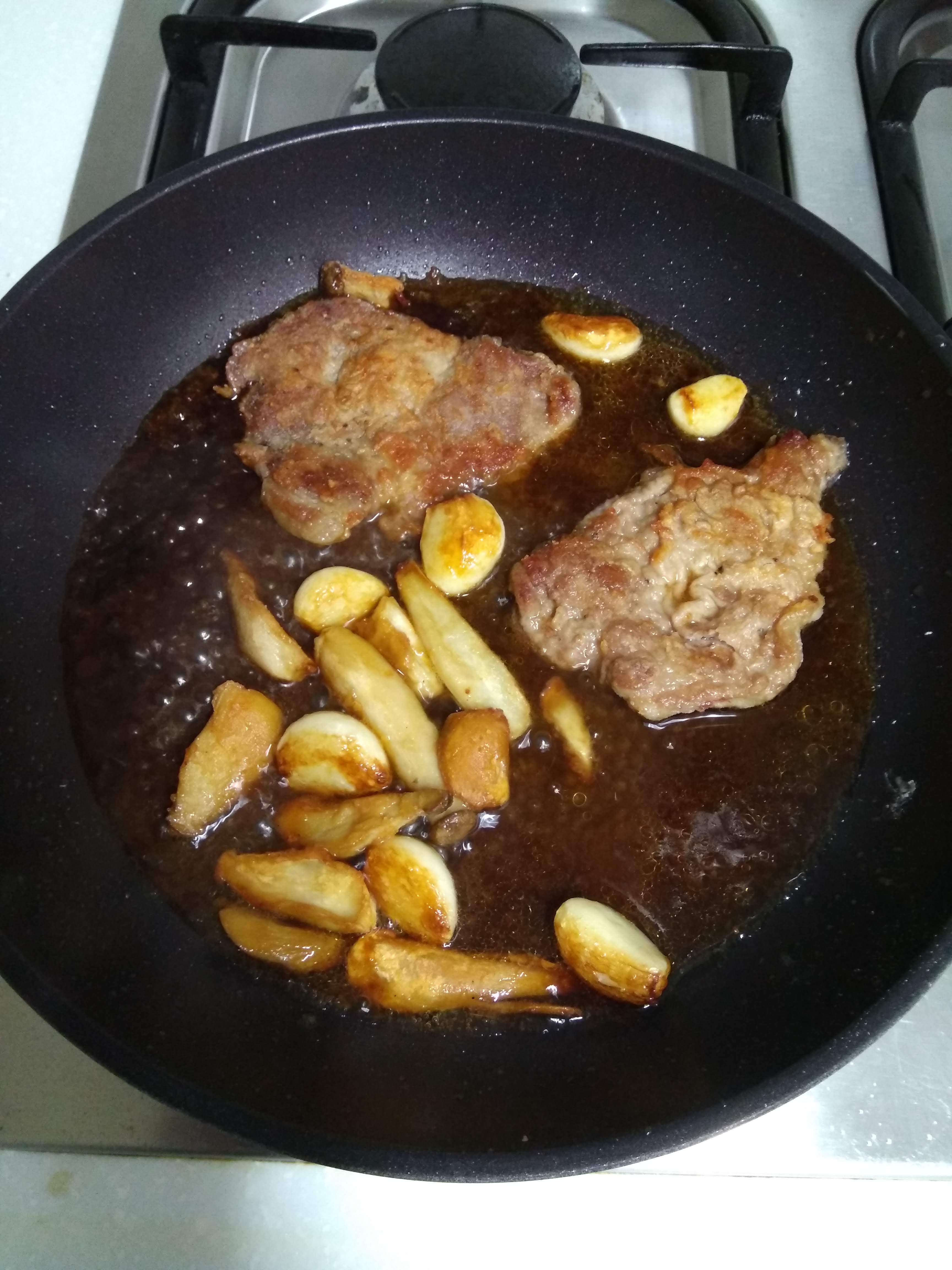 재료: 돼지고기 목살, 스테이크 소스(오뚜기), 밀가루, 가니쉬(마늘, 버섯 등등), 밑간(소금, 후추)